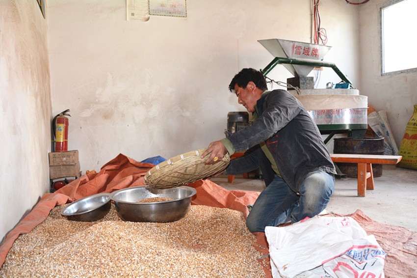 事實(shí)上,小作坊的準(zhǔn)確名稱是仁果下村電磨坊合作社,屬于村里的集體經(jīng)濟(jì),廠房的建設(shè)、機(jī)器的購買都來源于扶貧專項(xiàng)資金。建成后,合作社提供崗位,讓村里的貧困戶來操作運(yùn)營。于是,洛桑降措成為了這里的“主人”。