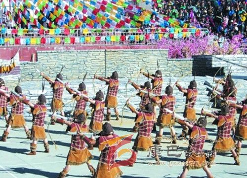 在催人奮進(jìn)的戰(zhàn)鼓聲中,一群身披甲胄的士兵拿著長劍,背著巨弓走到臺(tái)前,在鏗鏘的戰(zhàn)鼓聲中,戰(zhàn)士們做著各種競技動(dòng)作,模仿武士們互相攻擊的樣子,那矯健的身影展示了遠(yuǎn)古時(shí)代嘉絨藏族先民們?yōu)榱松媾c自然努力抗?fàn)幍膱?chǎng)景。過了一會(huì)兒音樂一轉(zhuǎn),戰(zhàn)鼓聲漸漸減弱,在鳥雀的陣陣啾啾聲中,一座木門慢慢的開啟,一位身披長袍、頭戴鳳冠的女王在眾多美女的簇?fù)硐?,緩緩走下臺(tái)階步入舞臺(tái)中央,此時(shí),一位手捧托盤的老者來到女王面前單膝下跪,將托盤高舉過頂,并邀請(qǐng)女王品嘗佳肴,女王將中指在酒中蘸了蘸,并曲起中指向四周輕輕彈去,寓意愿將杯中美酒與四方百姓同飲。在女王面前還放置著一個(gè)凈水桶,桶中盛滿了清澈的甘泉,桶上橫放著一枝柏樹枝,女王伸出纖纖玉手,拿著柏樹枝在水中蘸了蘸,面向墨爾多神山撒去,寓意向神山祈福。這是此次《美人谷·丹巴》節(jié)目展演中的序曲部分,有著強(qiáng)烈的東女神韻,將遠(yuǎn)古時(shí)代東女國女王遺風(fēng)展演的淋漓盡致。