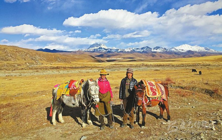 本網訊(劉鈞 文/圖)作為康定市純牧業(yè)鄉(xiāng)鎮(zhèn)的塔公鎮(zhèn),今年7月全力推進綜合整治以來,實現(xiàn)牧旅結合,塔公草原天更藍水更綠,成為游客向往的天堂。初冬的塔公草原,下馬龍村牧民石多(左)正和同伴為游客提供騎游服務。