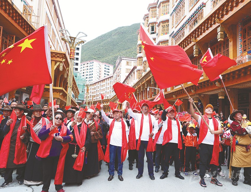 伴隨著悠揚的旋律,在當?shù)馗袼_爾藝術(shù)團演員的帶領(lǐng)和感染下,幾千名當?shù)馗刹咳罕娚碇A服,揮舞著手中的五星紅旗,懷著無比激動的心情獻歌祖國,同唱《我和我的祖國》。深情激昂的歌聲感染到在場的每一個人,有的高呼喝彩、有的熱淚盈眶,齊聚在鮮紅的國旗下,齊聲高喊:“我愛祖國,祖國萬歲!”