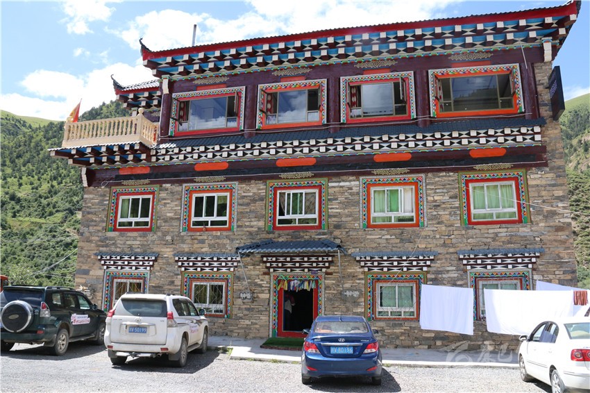 該酒店三樓一底,集餐飲、停車、住宿為一體,設(shè)單標(biāo)間和套房共計(jì)22間38個(gè)床位,雇傭了3名當(dāng)?shù)卮迕駧凸ぃ簝?nèi)甚至配套了超市和茶樓;藏文化元素俯仰皆是,雕梁畫棟,規(guī)模配備,儼已成為全縣鄉(xiāng)鎮(zhèn)一道亮麗風(fēng)景。不論淡旺季,每間房價(jià)188元至258元不等。夏季正值入住高峰期,8月以來,幾乎天天客滿。