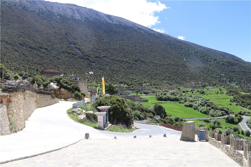 從觀景平臺向村子進發(fā),一棟棟用石塊砌成的藏房次第映入眼簾,每一棟藏房都有獨立的院落,院墻上是堆放整齊的木柴,墻邊是造型別致的花臺,有的房頂上還掛著五星紅旗。走到村口,黑化通村路變成了硬化聯(lián)戶路,道路寬敞整潔,路旁有太陽能路燈、電子監(jiān)控、綠化花草和公共廁所;村中央的廣場上聚滿了人,他們有的是外來游客、有的是當?shù)卮迕?,有的在曬著太陽閑聊,有的在對著美景拍照。在村里,記者還發(fā)現(xiàn)有幾個小賣部、不少私家車和好幾大片長勢良好的菜地,地里有一些人在勞作。