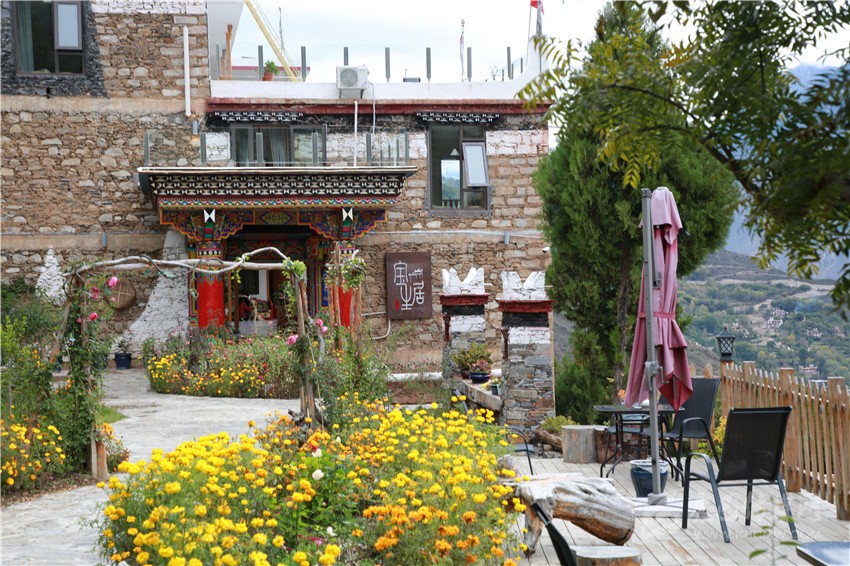 劉國芳告訴記者,花筑田園酒店的誕生,源于她的兒子和廣東東莞幾名游客的一段佳話,兒子安俊杰在跑成都到亞丁包車業(yè)務(wù)的時候,認識了包車到亞丁的東莞游客趙雯、常妹、千麗、雙燕和成都的峰哥,一路上,開朗的安俊杰博得了客人的信任和好感。安俊杰邀請她們到甲居藏寨作客。幾位客人到甲居考察后,立即表示愿意投資在聶呷鄉(xiāng)開辦鄉(xiāng)村酒店。劉國芳請示縣鄉(xiāng)領(lǐng)導(dǎo)同意,決定將自己的自留地拿出來合資開辦酒店。5位客人立即出資10萬元用于整修道路,隨后出資100萬元,于2016年按照鄉(xiāng)村酒店的標準開始修建花筑田園酒店。酒店共有18個房間,建筑突出了丹巴嘉絨風格,以玫瑰、菊花、薰衣草等花卉為主,集觀賞、休閑、康養(yǎng)為一體,增強了游客的體驗度和舒適感。2018年5月酒店開門迎客,到今年10月已盈利50多萬元。