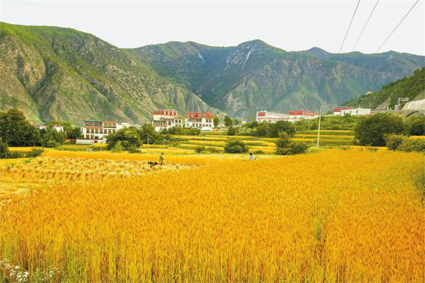 圖為9月23日,鄉(xiāng)城縣香巴拉鎮(zhèn)馬色村村民正在收割小麥。
