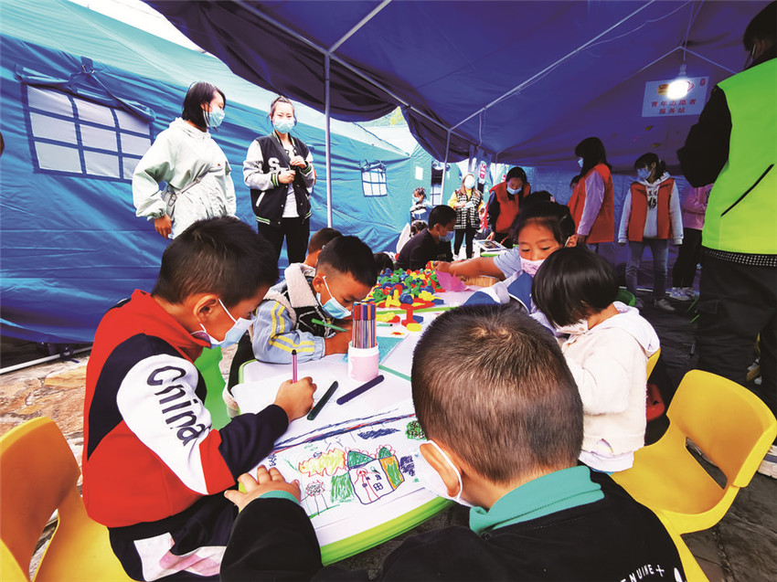 “這頂帳篷中充滿了孩子們的歡聲笑語,這在地震災(zāi)區(qū)就是最動聽的聲音?!惫睬鄨F(tuán)甘孜州委統(tǒng)戰(zhàn)社會聯(lián)絡(luò)部部長澤仁娜姆介紹,地震發(fā)生后,團(tuán)州委第一時間組織3193名志愿者,24支青年突擊隊(duì)參與應(yīng)急志愿者工作,并在磨西鎮(zhèn)貢嘎廣場分配38名志愿者參與后勤保障工作,其中5個人便成為了“青青兒童樂園”里的“保育員”,“孩子們可以在這里畫畫、做游戲,還能在老師輔導(dǎo)下學(xué)習(xí),他們不安的情緒也得到安撫,臉上的恐懼也逐漸被微笑取代?!?/p>