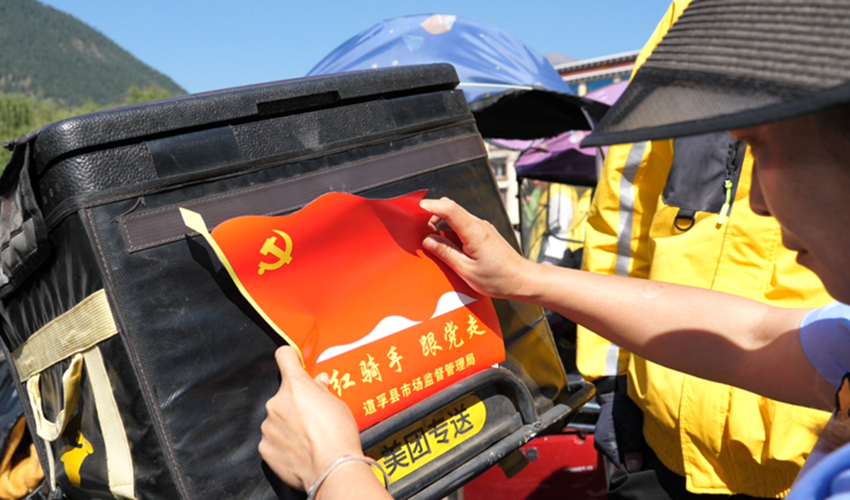 工作人員正在張貼“紅騎手 跟黨走”標(biāo)識。