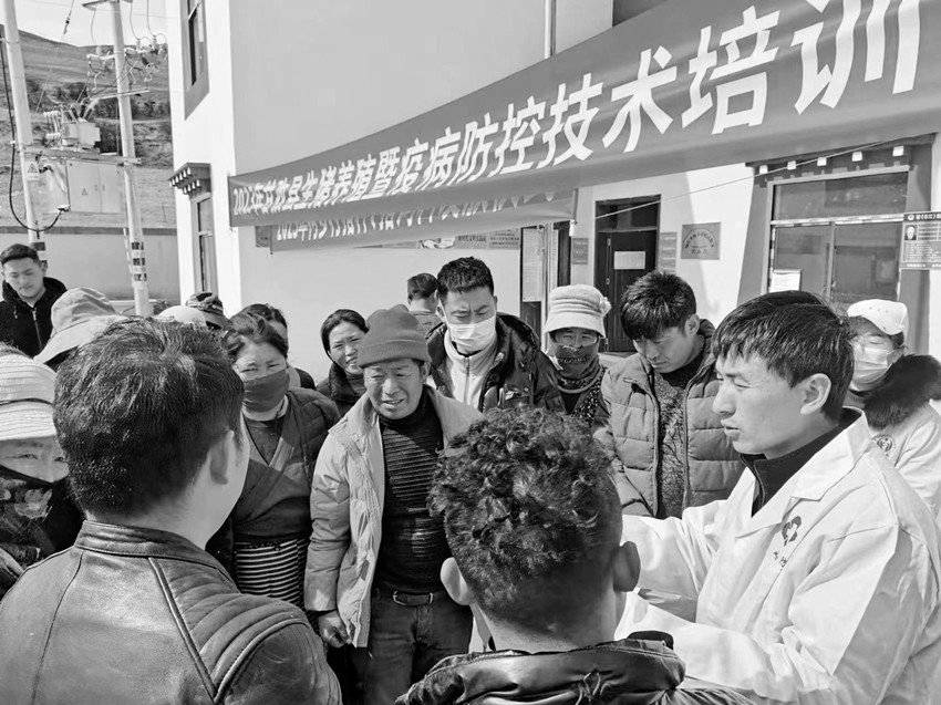 農(nóng)牧專(zhuān)家向村民講解養(yǎng)殖技術(shù)。