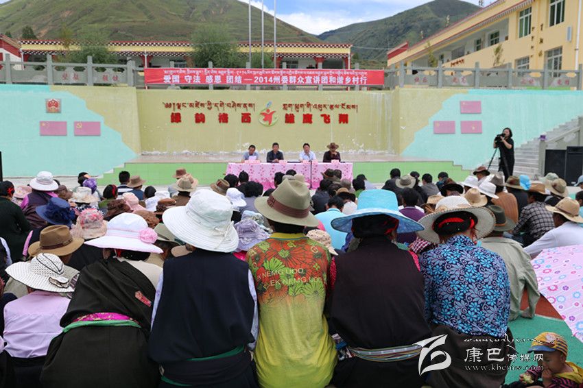 “2014州委群眾宣講團和諧鄉(xiāng)村行”宣講團9月11日下午來到道孚縣格西鄉(xiāng),在格西鄉(xiāng)中心校內,群眾們早早到來,盤腿坐在塑膠跑道上,認真聽州民干校高級講師仁志降澤用藏文講述的一個又一個通俗易懂的小故事,感知“愛國 守法 感恩 團結”八個字。他還結合具體實例講述法律、交通方面知識,大家聽得聚精會神,時而被降澤老師的小故事逗的捧腹大笑,時而陷入了深深的思考。