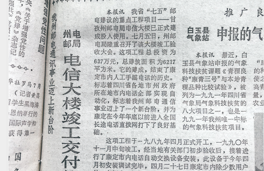 翻開33年前的報紙,1991年7月6日甘孜報一版一則題為《州郵電局電信大樓竣工交付使用——我州郵電通訊事業(yè)邁上新臺階》的新聞,記錄了我州康定結(jié)束市內(nèi)人工手搖電話的歷史。文中記錄了康定市內(nèi)電話自動交換設(shè)備安裝和調(diào)試的具體日期,并稱自當年4月27日起,除康定市內(nèi)少數(shù)用戶外,全部電話機均由人工交換機改為直撥電話機。