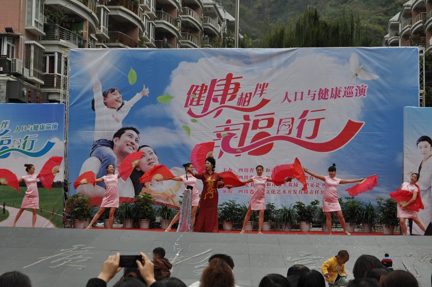 舞臺(tái)上“健康相伴•幸福同行”大型演出背景格外醒目,由省虹宇藝術(shù)團(tuán)自編自演的舞蹈《歌舞青春》、金錢板《怪哪個(gè)》、小品《你生不生》、四川清音《分級(jí)診療就是好》、雜技《烏依人》、戲曲《天府奇葩》等節(jié)目陸續(xù)登場。演員們通過戲曲、歌曲等形式,向廣大觀眾傳播衛(wèi)生計(jì)生新政策,臺(tái)下各縣屬醫(yī)療衛(wèi)生計(jì)生機(jī)構(gòu)醫(yī)務(wù)人員免費(fèi)開展義診活動(dòng),為廣大群眾查血壓、詢問病史、咨詢等忙個(gè)不停,群眾與演員互動(dòng)場面感人。演出活動(dòng)取得良好的教育效果,得到廣大群眾的熱烈歡迎。
