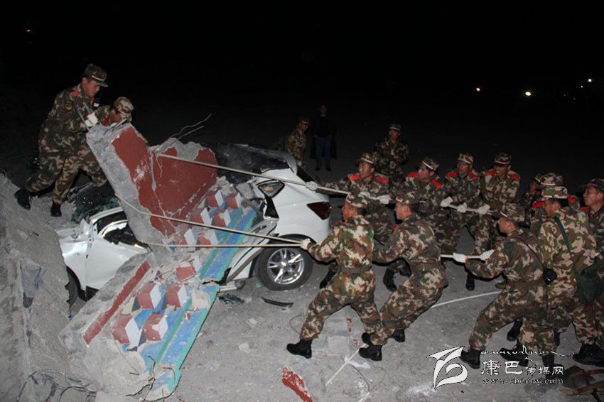 第一批進(jìn)入震中的甘孜森林支隊官兵搶救被困車輛。翁小鵬 攝