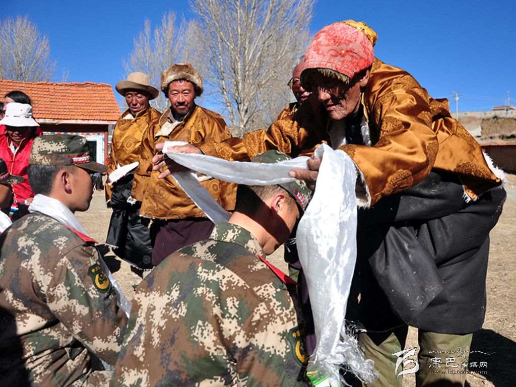 春節(jié)期間,理塘縣敬老院老人為前來(lái)慰問的官兵獻(xiàn)哈達(dá)。