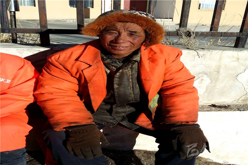 春節(jié)快到了,石渠的最低氣溫已低至零下20余攝氏度,在這呵氣成霜、滴水成冰的季節(jié),大街小巷卻仍然能看見身穿橙色工作服還在起早貪黑地辛勞工作著的人們,他們就是石渠的環(huán)衛(wèi)工人。年近60的澤仁羅布便是其中的一員,雖然他雙頰已被風(fēng)霜刻畫出道道溝壑,但身體卻很硬朗,閑暇的時(shí)候他喜歡和大家在工作的附近找一處陽光充足的地方曬曬太陽、聊聊天。