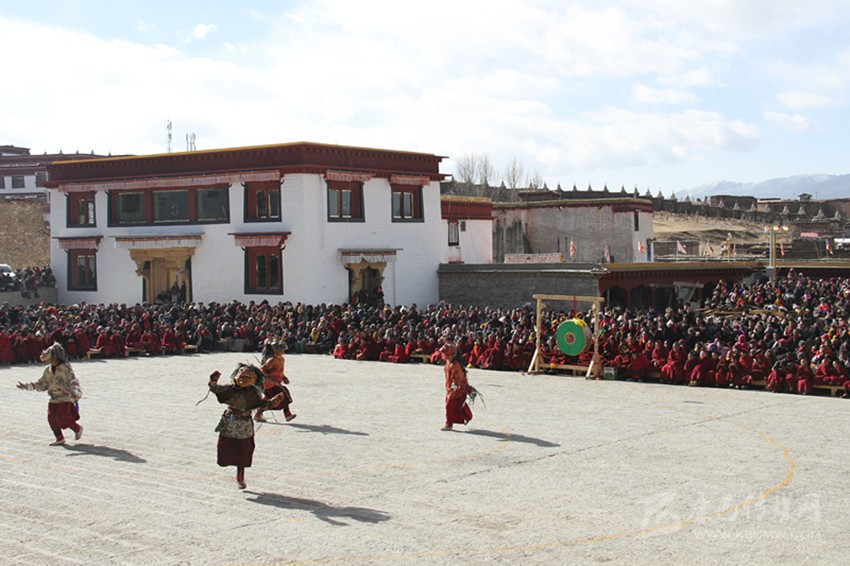 2月25日,是藏歷的12月29日,理塘縣長青春科爾寺舉行了盛大的“古多”儀軌活動。僧人在寺廟廣場表演“羌姆”,各區(qū)鄉(xiāng)鎮(zhèn)農(nóng)牧民群眾近萬人匯聚于此,觀看表演?!扒寄贰币鉃樘?,是藏傳佛教中融宗教性、藝術(shù)性為一體的法舞儀式,本地藏族群眾又稱其為“巴羌”,即“面具法舞”,寄寓了人們辭舊迎新、禳災(zāi)祈福的美好愿望。