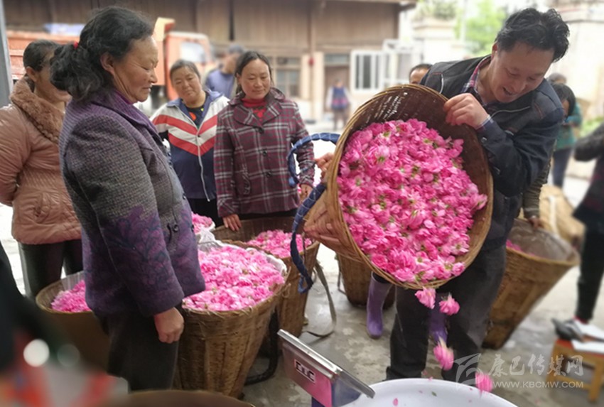 16日上午,小雨停了下來,趕在太陽出來之前采摘的玫瑰花出油率好,是采摘的黃金時間。在燕子溝鎮(zhèn)新龍門子村生產(chǎn)加工點(diǎn),周邊農(nóng)戶將采摘的粉色玫瑰花瓣過秤,逐筐倒進(jìn)特定的堆放地點(diǎn),農(nóng)戶們也收到了應(yīng)得的勞務(wù)收入,空氣中彌漫著一股玫瑰花特有的芳香和浪漫,也充滿了當(dāng)?shù)匕傩招腋:吞鹈鄣奈兜馈?/span>