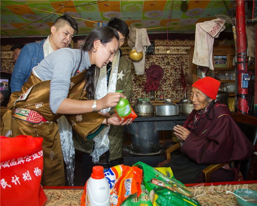 為了及時將物資送到群眾手中,公益小組一行當(dāng)日凌晨4點便從成都出發(fā),于下午1點到達走訪地石渠縣。隨后,公益小組不顧舟車勞頓,堅持走訪了10戶此次“新牧民養(yǎng)成計劃”示范家庭,為他們送上了生活禮包及文明禮包,并送上了節(jié)日的祝福。年過七旬的卓嘎是本次“新牧民養(yǎng)成計劃”示范戶之一,體弱多病的她堅持要迎接公益小組的到來,并獻上哈達。收到物資后她激動地說,兩年前華僑城來到石渠縣,為他們帶來了新棉被,那個冬天他們一點都不冷,現(xiàn)在又送來了糧食和生活用品,讓他們可以過上更好的生活。