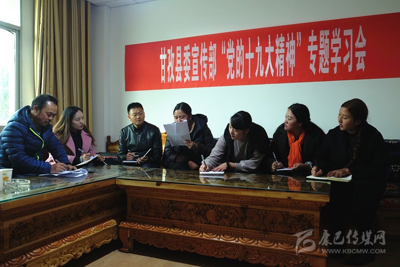 本網(wǎng)訊 (則瑪拉姆 文/圖)連日來(lái),甘孜縣依托中心組、干部講堂、“三級(jí)三講”等學(xué)教平臺(tái),圍繞“黨的十九大精神、《中國(guó)共產(chǎn)黨章程(修正案)》、習(xí)近平新時(shí)代中國(guó)特色社會(huì)主義思想、決勝全面建成小康社會(huì)”四大專題開(kāi)展學(xué)習(xí),采取專家輔導(dǎo)講、專題研討學(xué)、集中考學(xué)評(píng)等形式,迅速組織廣大黨員干部原原本本學(xué)、聯(lián)系實(shí)際學(xué)、突出重點(diǎn)學(xué),切實(shí)把黨的十九大精神轉(zhuǎn)化為謀劃發(fā)展的思路、促進(jìn)發(fā)展的舉措、領(lǐng)導(dǎo)發(fā)展的能力和推進(jìn)發(fā)展的合力。圖為11月6日下午,縣委宣傳部組織全體職工專題學(xué)習(xí)黨的十九大精神。