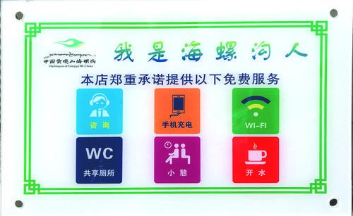 “我們長征大酒店在提高服務(wù)質(zhì)量的同時也掛了這個牌子,我們承諾為客人提供免費(fèi)的開水、充電、共享廁所等服務(wù),讓客人對海螺溝有一個美好的印象,在海螺溝過的開心愉快。”長征大酒店負(fù)責(zé)人楊德黎說。