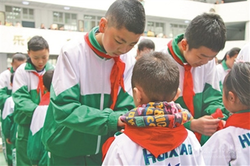 康定市回民小學六年級學生為新入隊學生佩戴紅領巾。