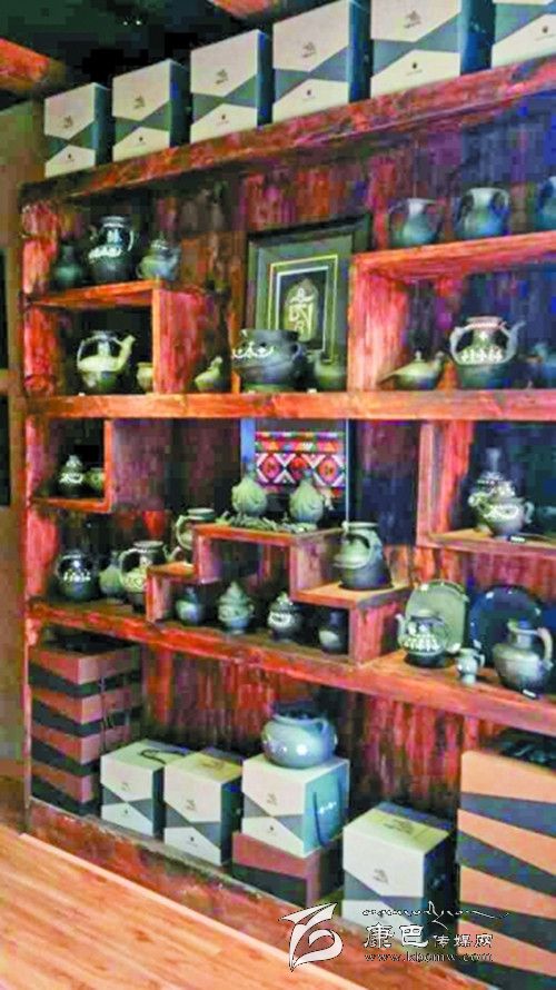 專賣店位于康定情歌廣場右側(cè)。店面古樸簡潔,店鋪內(nèi),沒有華麗的裝飾,沒有鮮亮的色彩,一件件或黑色、或土黃色的土陶產(chǎn)品靜靜地?cái)[放在木質(zhì)陳列架上。產(chǎn)品有傳統(tǒng)的器形,如雙耳罐、香爐、茶壺等,又有新研發(fā)出的器形,如茶具、餐具、筆架等等。產(chǎn)品在將傳統(tǒng)工藝與現(xiàn)代工藝巧妙結(jié)合的基礎(chǔ)上,還融入了藏族傳統(tǒng)文化,民俗文化、宗教文化、吉祥文化等元素,以其拙樸典雅的造型向人們?cè)V說著“阿西土陶”悠久的文化內(nèi)涵與歷史淵源。