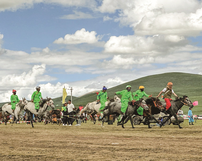 賽馬是藏族群眾娛樂生活的主要內容,是極具特色的民俗活動,是藏族群眾對力量、勇敢、智慧的向往和崇拜,也是一項充滿激情的傳統(tǒng)民族體育運動。近年來,色達縣利用“金馬節(jié)”這一傳統(tǒng)民族節(jié)日,開展了長跑、短跑和走馬等賽馬比賽,在遼闊的扎青塘草原中央,騎手們與賽馬緊密配合,英姿颯爽,風采盡顯,卓越的表現(xiàn)引得場外加油聲、喝彩聲此起彼伏,群馬奔騰的景象震撼人心,讓前來觀賽的群眾大飽眼福,嘆為觀止。
