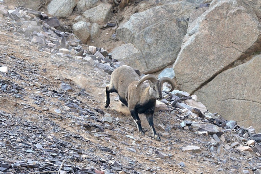 在回程的時(shí)候又看到一群巖羊,大約有20余只。這次與它們接近的距離僅有5、6米的地方。它們?cè)陉?duì)員們的面前若無其事地吃草,只有一只母羊抬頭看了隊(duì)員們一會(huì)兒。和這只母羊如此近距離接近,以至于能看清它的眼神里似乎只有一些疑惑,卻沒有恐懼。