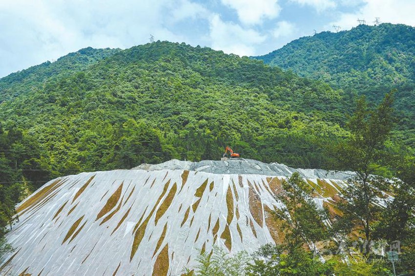 大柏牛棄渣場坡頂、坡面撒的草籽已冒芽,棄渣場看起來綠油油的一片;海子溝棄渣場表面蓋著防止渣土滑落的油布,底部砌起了一堵厚厚的擋墻,為河道讓出空間……