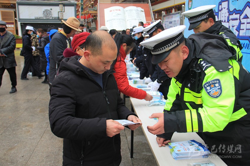 交警在康定情歌廣場開展“一盔一帶”安全宣傳活動。
