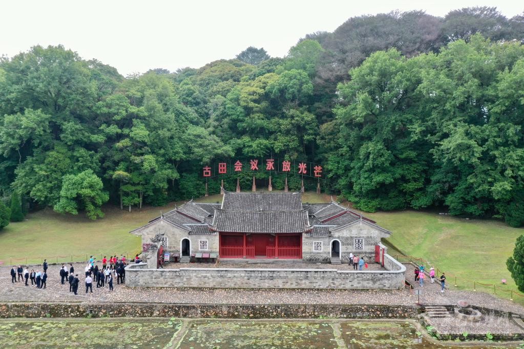 游客在福建省龍巖市上杭縣古田鎮(zhèn)古田會(huì)議會(huì)址參觀(guān)(2021年5月9日攝,無(wú)人機(jī)照片)。新華社記者姜克紅攝