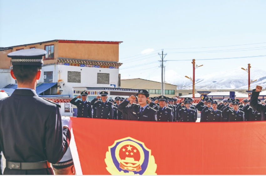 清明時(shí)節(jié)祭英烈,不朽精神傳后人。4月2日上午,石渠縣公安局開(kāi)展清明緬懷公安英烈活動(dòng),將因公犧牲民警王志剛封存7年的警號(hào)066171重啟,由其女馬怡琳“接力”佩戴?!皞鬟f”之間,銀色警號(hào)在陽(yáng)光下璀璨奪目。