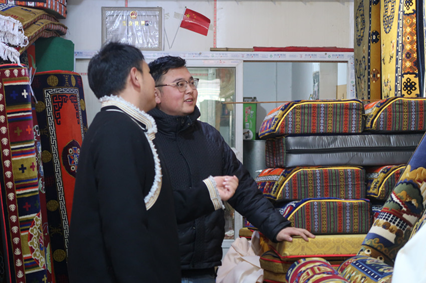這個(gè)30多平方米的商鋪內(nèi)人頭攢動(dòng),地毯、布料、銅鍋……各種物品應(yīng)有盡有?!疤鹤佑昧舜蟀肽炅耍|(zhì)量還是這么好,不僅沒(méi)變形,顏色還是那么鮮艷,所以今天專門來(lái)再買一個(gè)拿回家備用。”客人尼瑪說(shuō)。