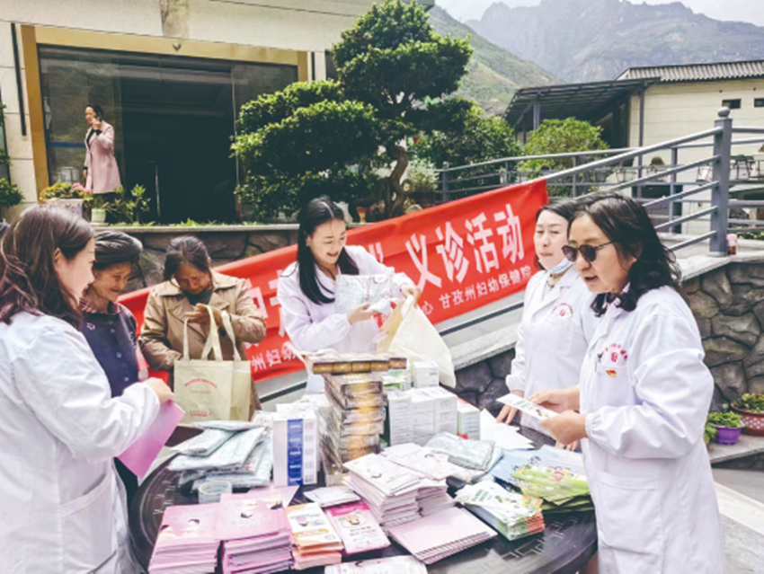 醫(yī)護(hù)人員為婦女群眾發(fā)放健康知識(shí)“大禮包”。