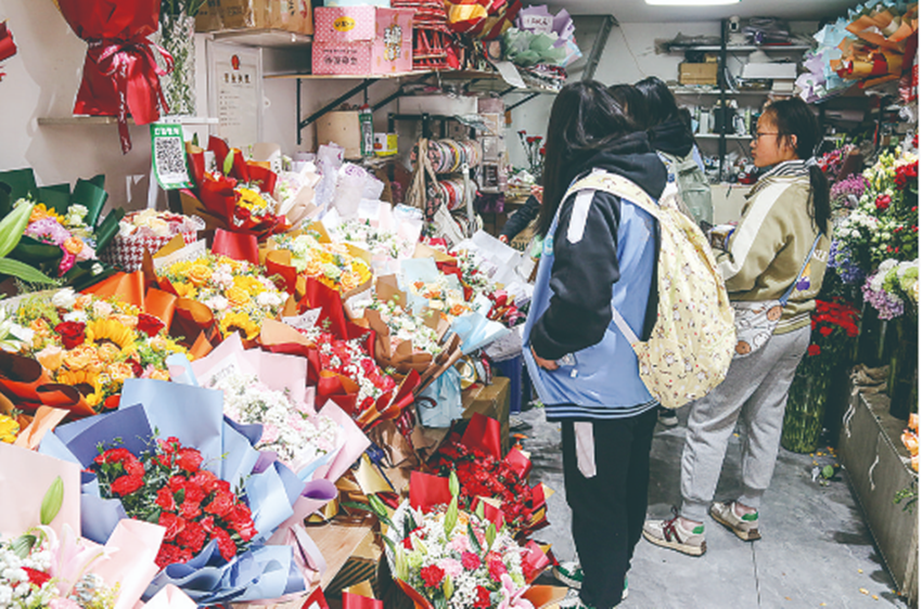 學(xué)生在愛花居花店為母親選購(gòu)鮮花。