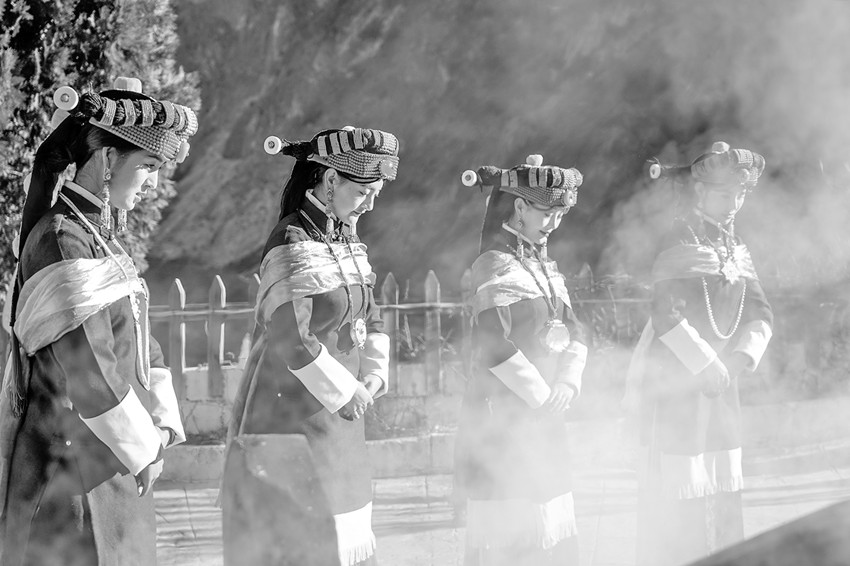 嘉賓體驗(yàn)團(tuán)首先來到位于甲居藏寨景區(qū)里的“點(diǎn)石·寶生居”特色民宿,只見一位年邁的嘉絨長者正主持“成人禮”儀式,桑煙裊裊,為即將成年的少女送去了誠摯祝福。完成儀式的嘉絨姑娘們隨長者一同跳起了非遺傳統(tǒng)舞蹈孔雀鍋莊,千年前東女古國的風(fēng)采得以重現(xiàn)。