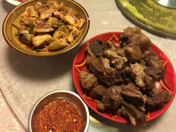 藏族同胞好將牛羊肉大塊入鍋大火煮之,剛過心則撈起。吃時(shí)手抓刀削入口,謂之手抓砣砣內(nèi)。冷熱食皆佳,肉嫩味鮮?,F(xiàn)在迎合大眾口味,有些用炒,有些用烤,蘸著海椒面,味道簡(jiǎn)直美味極了。