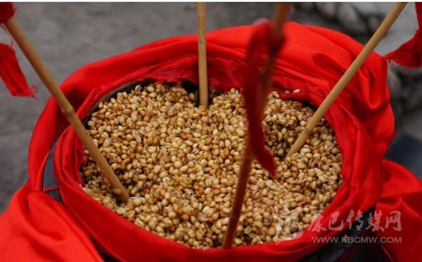嘉絨語(yǔ)稱“恰鹵”。咂酒是青稞釀制而成的。首先取一定數(shù)量的青稞粒,一般5斤、8斤或10斤,在大鐵鍋中用水煮成八成熟后,放在簸箕里晾開(kāi),待冷卻后放上一定比例的酒曲,合勻,又裝入大鐵鍋中發(fā)酵三至四天,待聞到酒香味后,裝入壇中并加水,放置一天以上后,即可取汁食用,這個(gè)汁就是咂酒。咂酒味甘甜淳厚,十 分爽口,看似不醉人,但有的甘甜之中略帶苦澀,說(shuō)明酒勁足,不勝酒力者應(yīng)少飲為宜。曾有人寫(xiě)《飲咂酒詩(shī)》說(shuō):“成石雜糧一甕收,王侯到此也低頭,五龍抱住 撐天柱,咂盡黃河水倒流”。充分展示了咂酒的魅力和飲咂酒的那種愜意。境內(nèi)巴底、半扇門的上半鄉(xiāng)、太平橋鄉(xiāng)一帶的群眾喜愛(ài)煮咂酒,平日,家家都備有咂酒,親朋間禮尚往來(lái)、人情世故都送咂酒。喝咂酒是當(dāng)?shù)氐囊淮罅?xí)俗。《章谷屯志(略)》記載了清朝后期宅壟土屯區(qū)的飲食習(xí)俗時(shí)說(shuō):“夷人(封建統(tǒng)治者對(duì)藏族的貶 稱)寨中置巨甕或木桶,富者大銅瓶盛酒,于內(nèi)植竹竿十余枝,跌坐于地互相吸飲,不杯杓勸酧(酬),無(wú)餚核(指熟食的魚(yú)肉干果),惟各布豬膘、牛肉、‘得木 鳥(niǎo)’(火燒子饃饃),醉飽而散”?,F(xiàn)在,巴底鄉(xiāng)、半扇門的上半鄉(xiāng)、太平橋鄉(xiāng)的大多數(shù)村寨仍然保留著這些習(xí)俗。在節(jié)日或慶典之時(shí),在大壩子中間放一個(gè)大的壇子或木桶,里面盛滿含有酒糟的咂酒,然后插入麥桿數(shù)根,眾人圍個(gè)大圓圈跳鍋莊,口渴時(shí)依次吸之;或一人手持葫蘆,里盛咂酒,在眾人中依次轉(zhuǎn)之;或眾人盤腿 圍坐,傳一壺咂酒,稱喝“轉(zhuǎn)轉(zhuǎn)酒”。